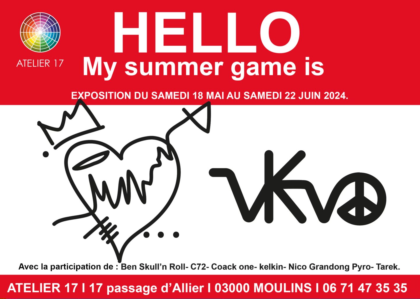 Exposition « Hello my summer game is » McGM.19 et VKV. Avec la participation des artistes : Ben Skull’n Roll- C72- kelkin- Nico Grandong Pyro- Tarek. DU SAMEDI 18 MAI AU SAMEDI 22 JUIN 2024. Galerie Atelier 17 – 17 passage d’Allier – 03000 MOULINS