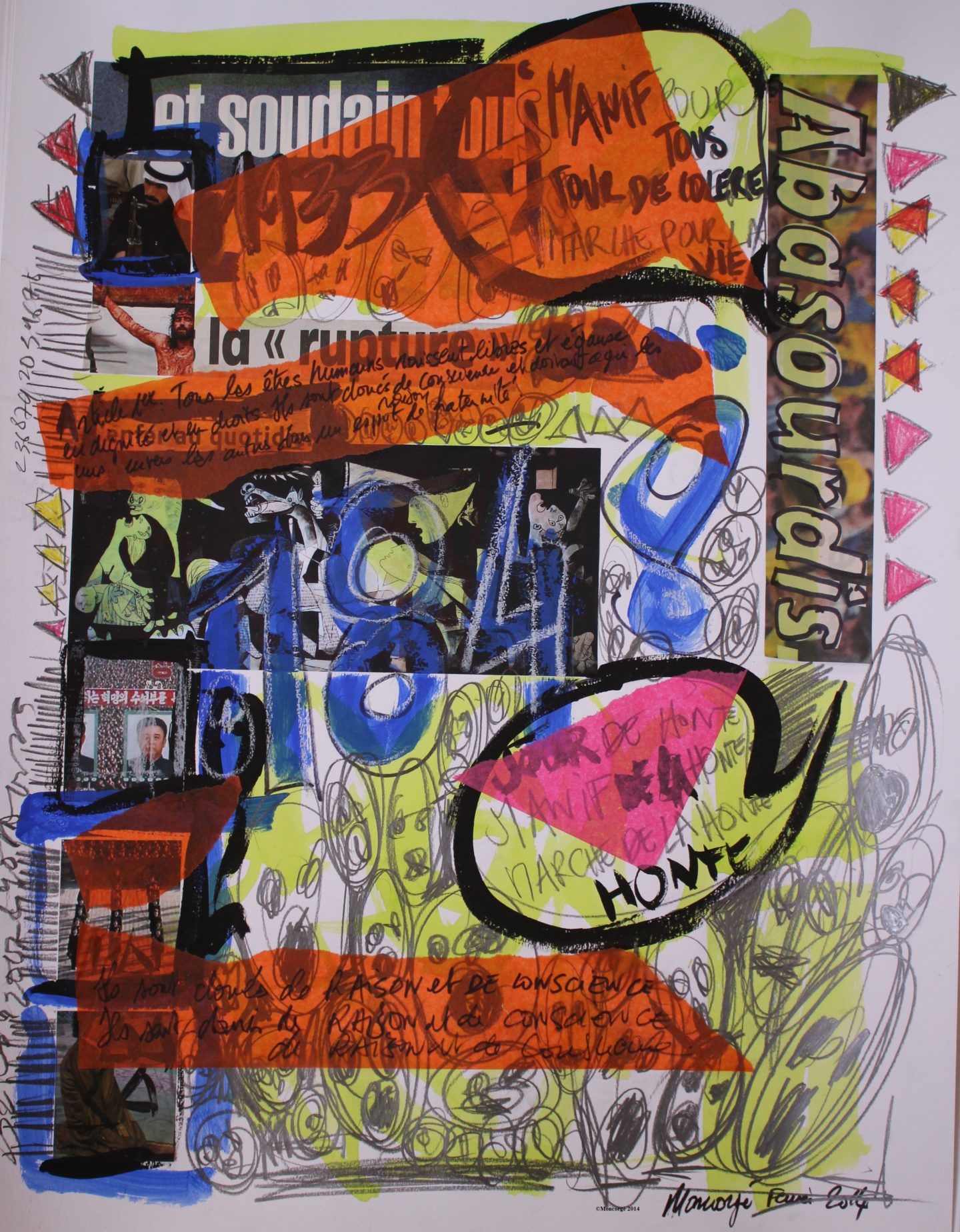 Acrylique, encres, collages, mines de plomb, crayons de couleur, marqueurs, sur papier Canson blanc 200 g. 50 x 65. 2014.
